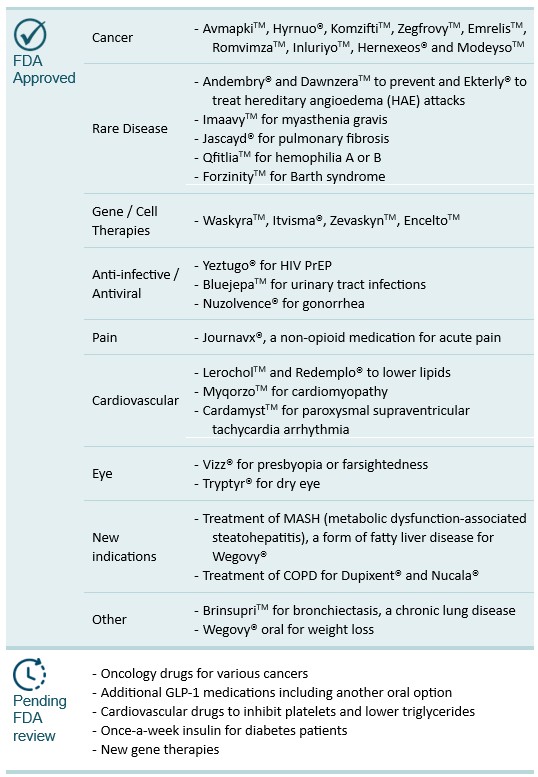 The pace of new drug approvals picked up during the second half of 2025, bringing the total to more than 50 new drugs and biologics for the year. Many offer new therapeutic approaches to challenging diseases. Cancer remains the most represented condition for new drugs. Drugs for several rare diseases, with many being first-in-class treatments, offer new hope for those patients. Cardiovascular drug approvals include new lipid lowering options and therapies to treat arrhythmias and cardiomyopathy. A new HIV pre-exposure prevention (PrEP) drug, drugs for dry eye and presbyopia (farsightedness), an every 6-month injectable for asthma, an antibiotic to treat sexually transmitted infections, a non-opioid pain medication and the first oral GLP-1 to for weight loss also received approval from the FDA.