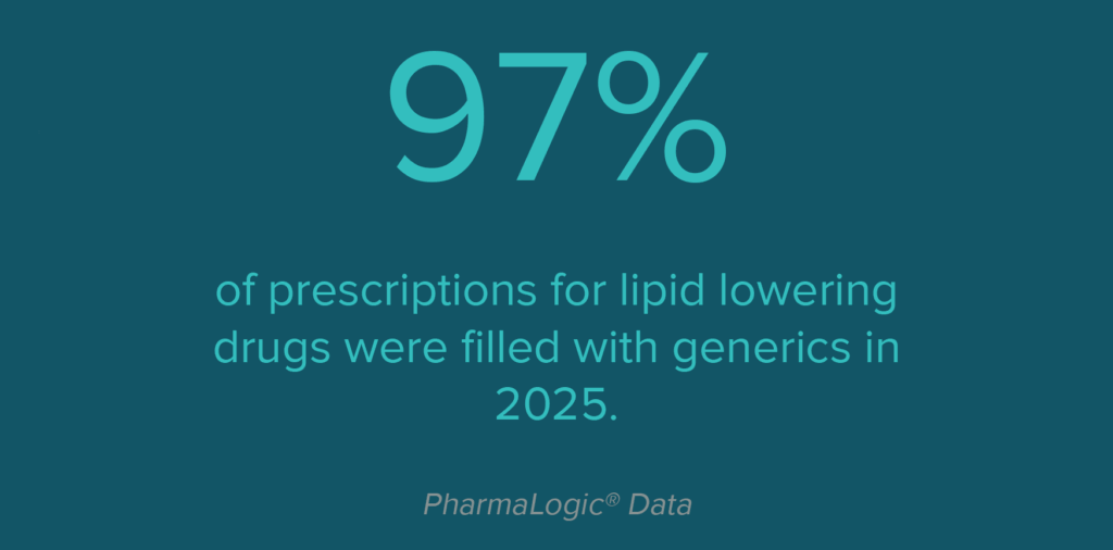 Prescribers also use other medications to block absorption of lipids and target other functions to decrease LDL (bad cholesterol), increase HDL (good cholesterol) and lower triglyceride levels. Some patients require additional medications that block or inhibit certain lipid proteins to achieve optimal cholesterol levels. These medications include Repatha®, Praluent®, Leqvio®, Redemplo® and Lerochol™ – all branded medications are under patent, with no generics currently available. Another new lipid protein blocker may receive FDA approval in 2026.
