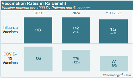 Influenza and COVID-19 vaccinations rates within pharmacy benefits were lower in 2025, declining 7% for influenza and 30% for COVID-19.